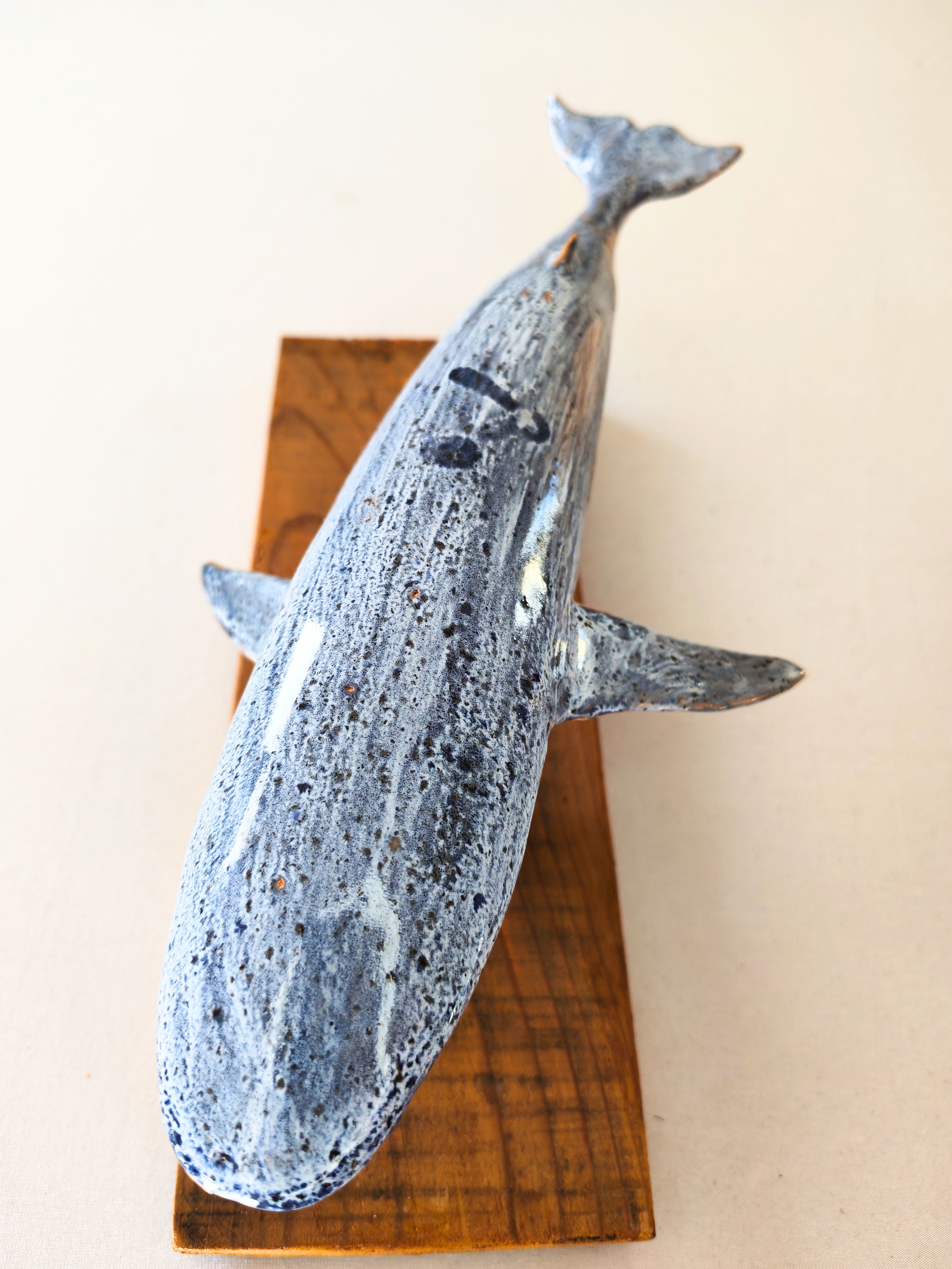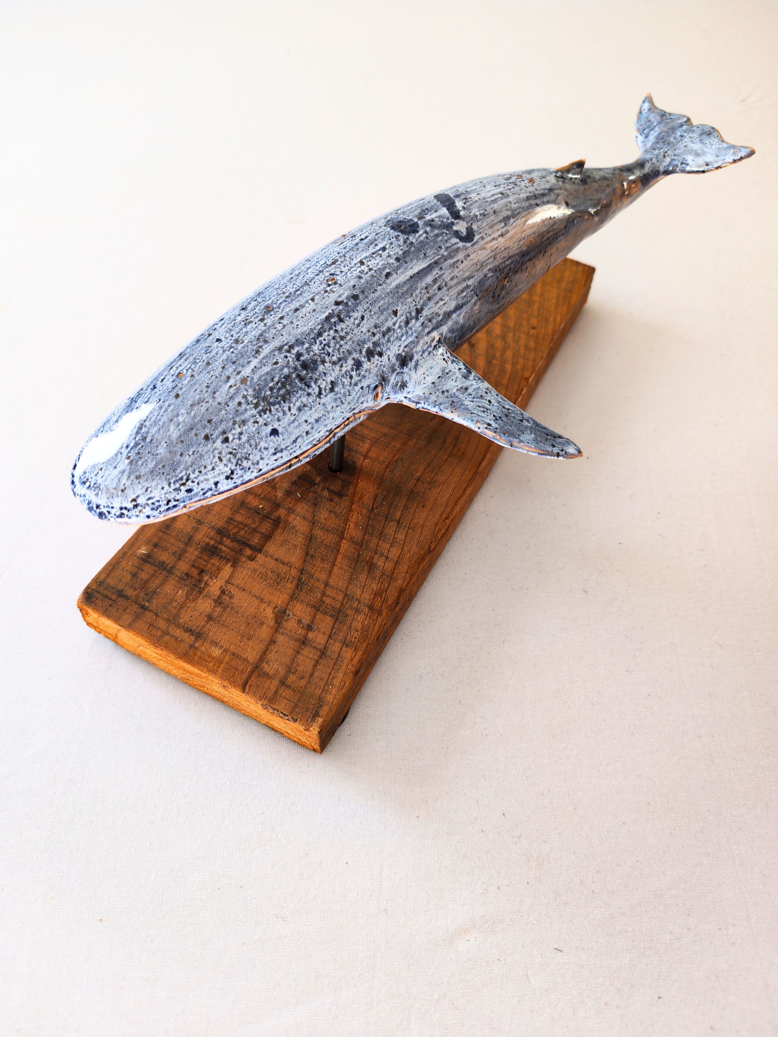 La grande baleine en céramique bleue semble surgir des flots dans un mouvement fluide et aérien. Son émaillage moucheté, capte la lumière et évolue selon l’angle du regard, donnant à cette pièce une présence vibrante et changeante.