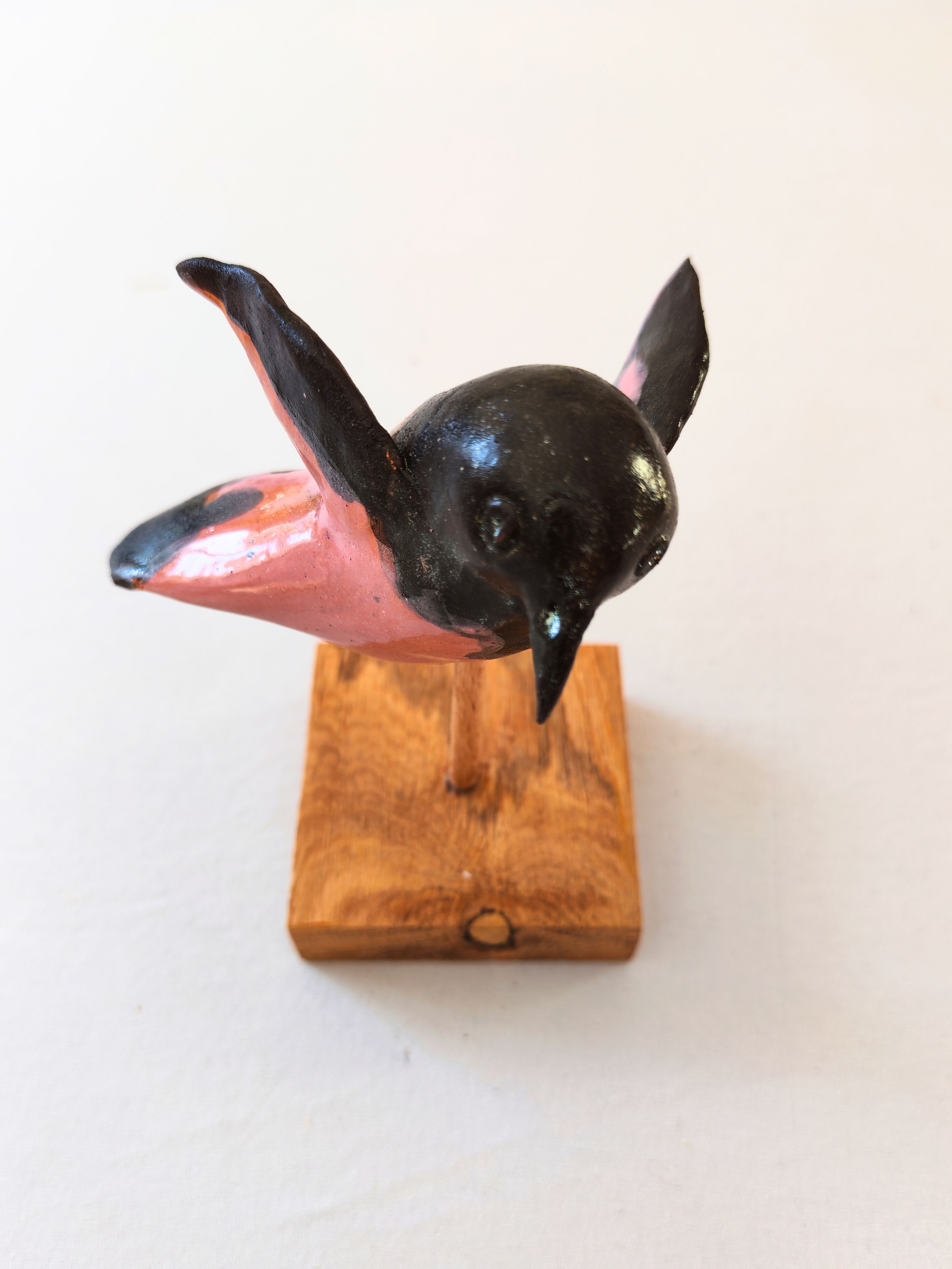 Découvrez CUICUI, un oiseau délicatement façonné à la main en céramique émaillée, une pièce unique qui incarne à la fois la légèreté et l’élégance du mouvement. Son plumage d’un rose et noir profond, sublimé par l’éclat de l’émail, capte la lumière et donne à cette sculpture une présence vivante et vibrante.