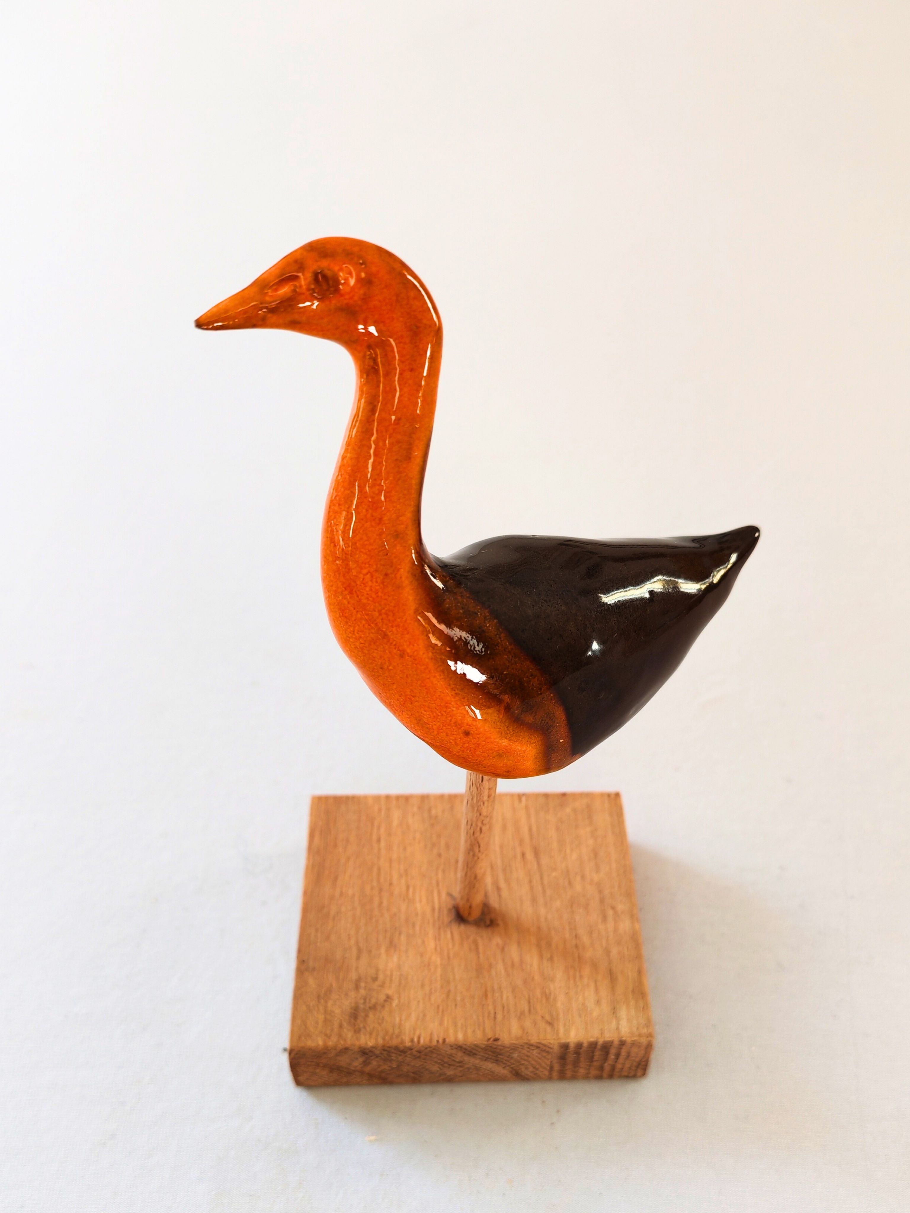 Cette poule d’eau en céramique est une création artisanale entièrement modelée et émaillée à la main. Son corps élancé, posé sur un socle en bois, met en valeur une silhouette élégante et expressive. Les émaux aux teintes orangées profondes et brun foncé offrent de subtils jeux de lumière et soulignent le caractère unique de chaque pièce.