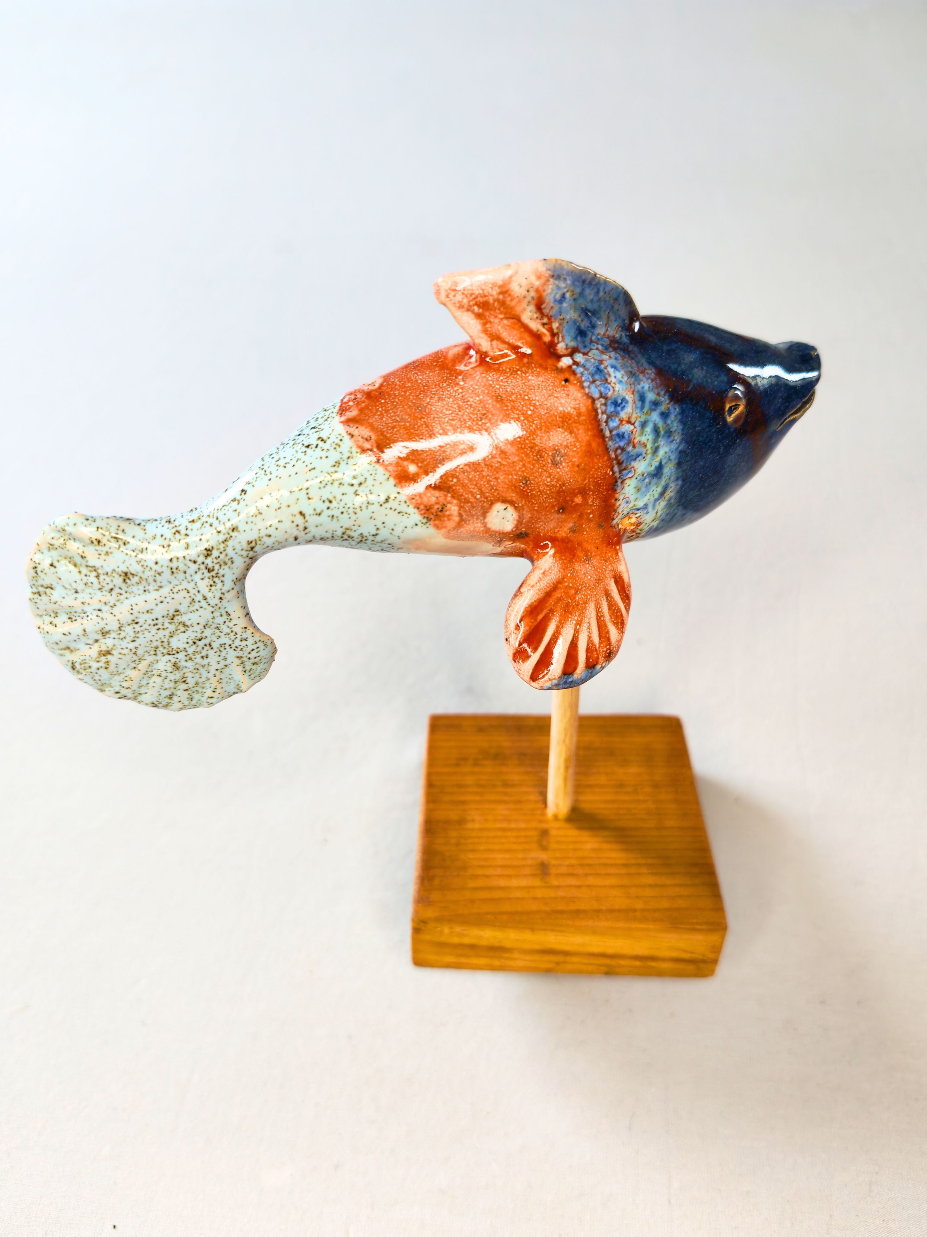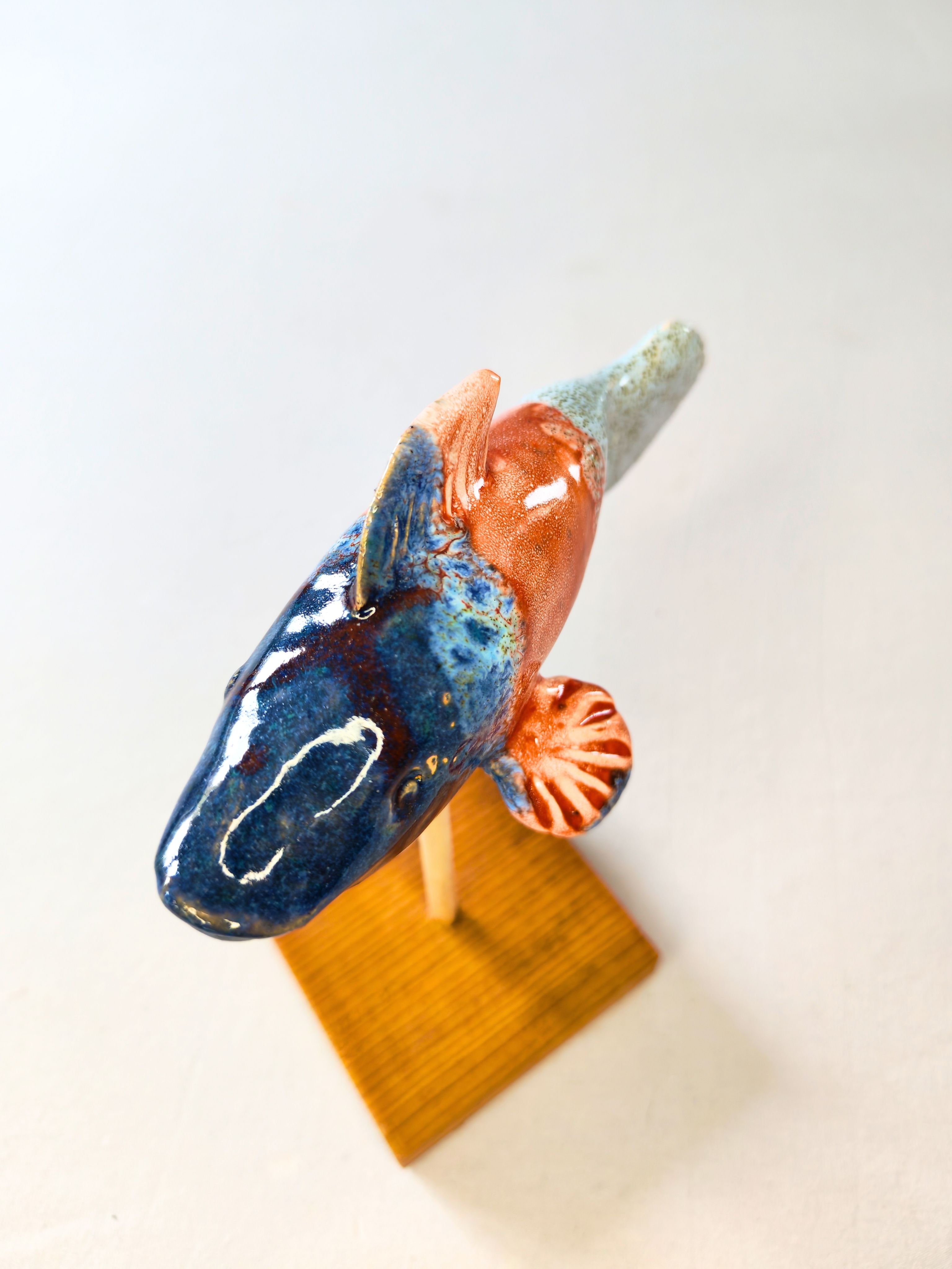 Ce poisson en céramique émaillée est une sculpture artisanale entièrement modelée et émaillée à la main. Posé sur un socle en bois, il semble suspendu dans le mouvement, comme figé dans un instant de nage. Les émaux mêlant des teintes bleutées, orangées et claires créent un jeu de contrastes lumineux et soulignent la singularité de la pièce.